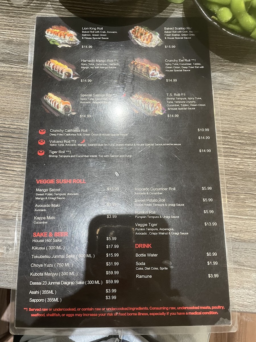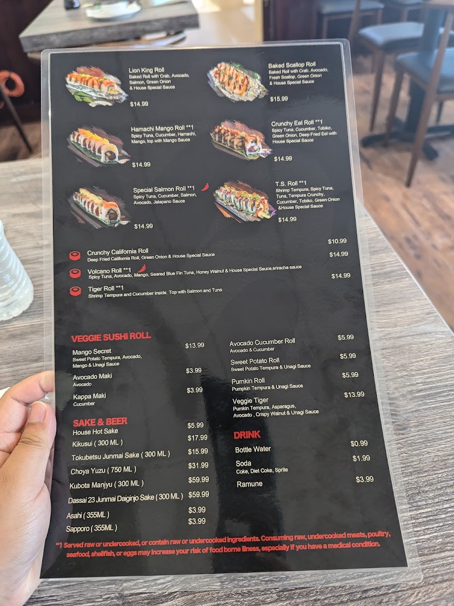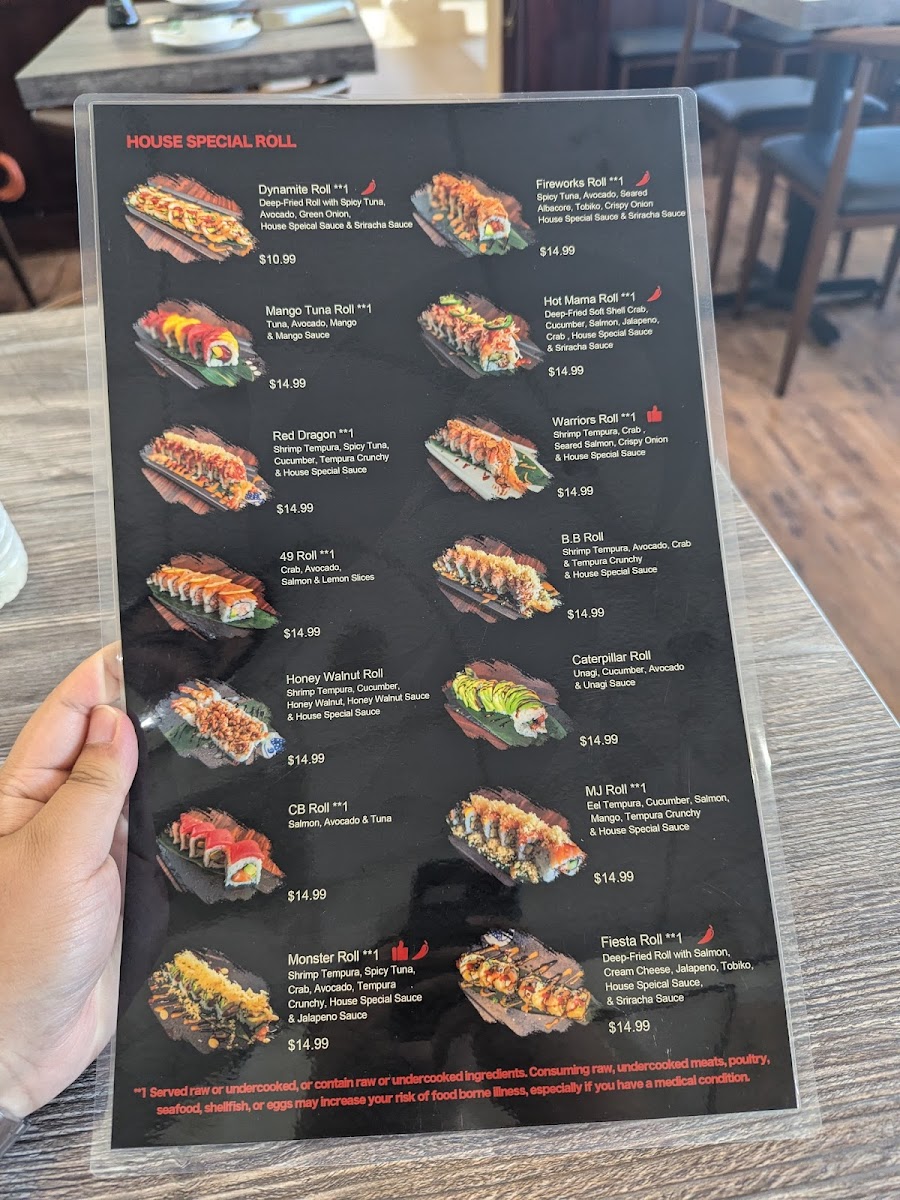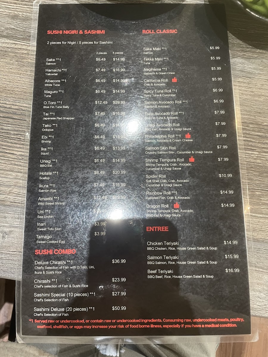 Entrees: The menu includes traditional Japanese entrees such as Chicken Teriyaki, Salmon Teriyaki, and Beef Teriyaki, served as main courses. These dishes provide a more substantial option compared to the sushi rolls and hand rolls.