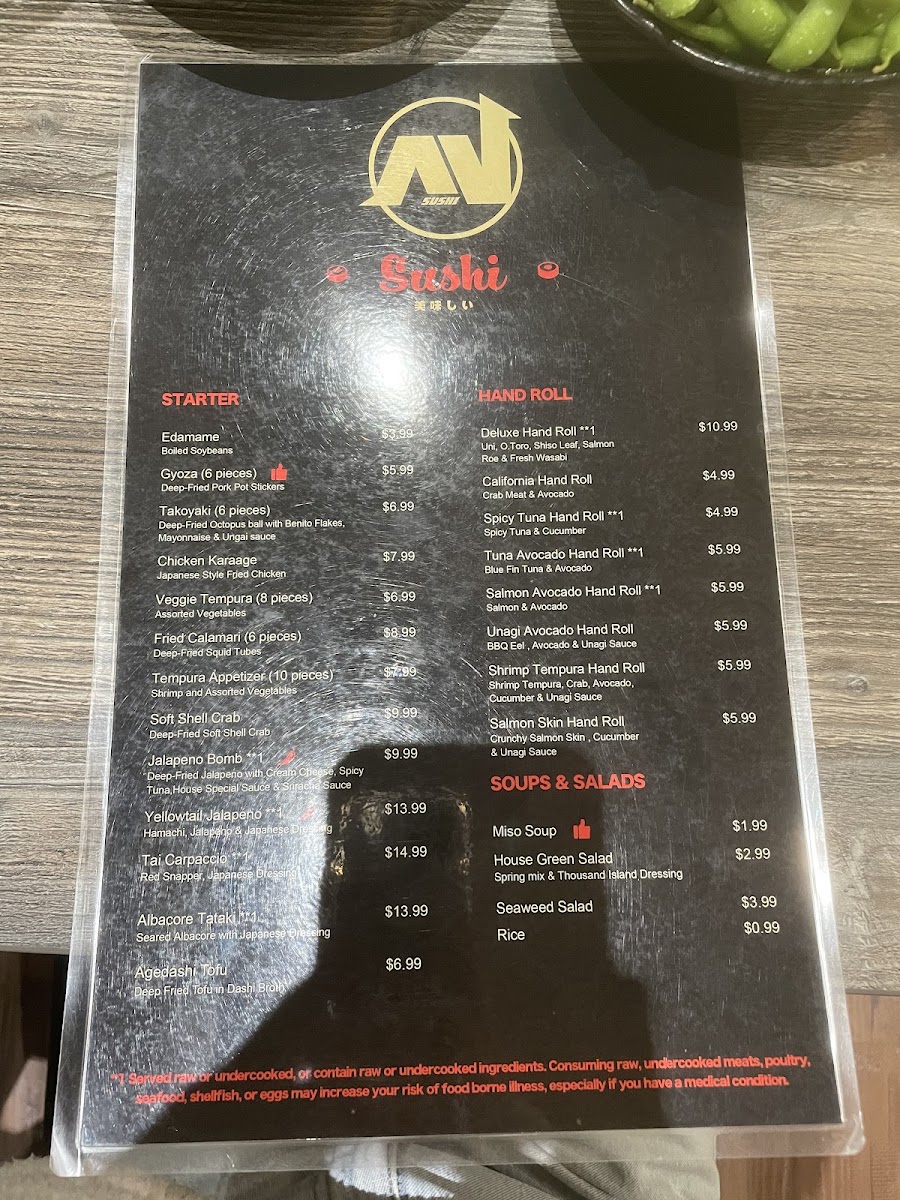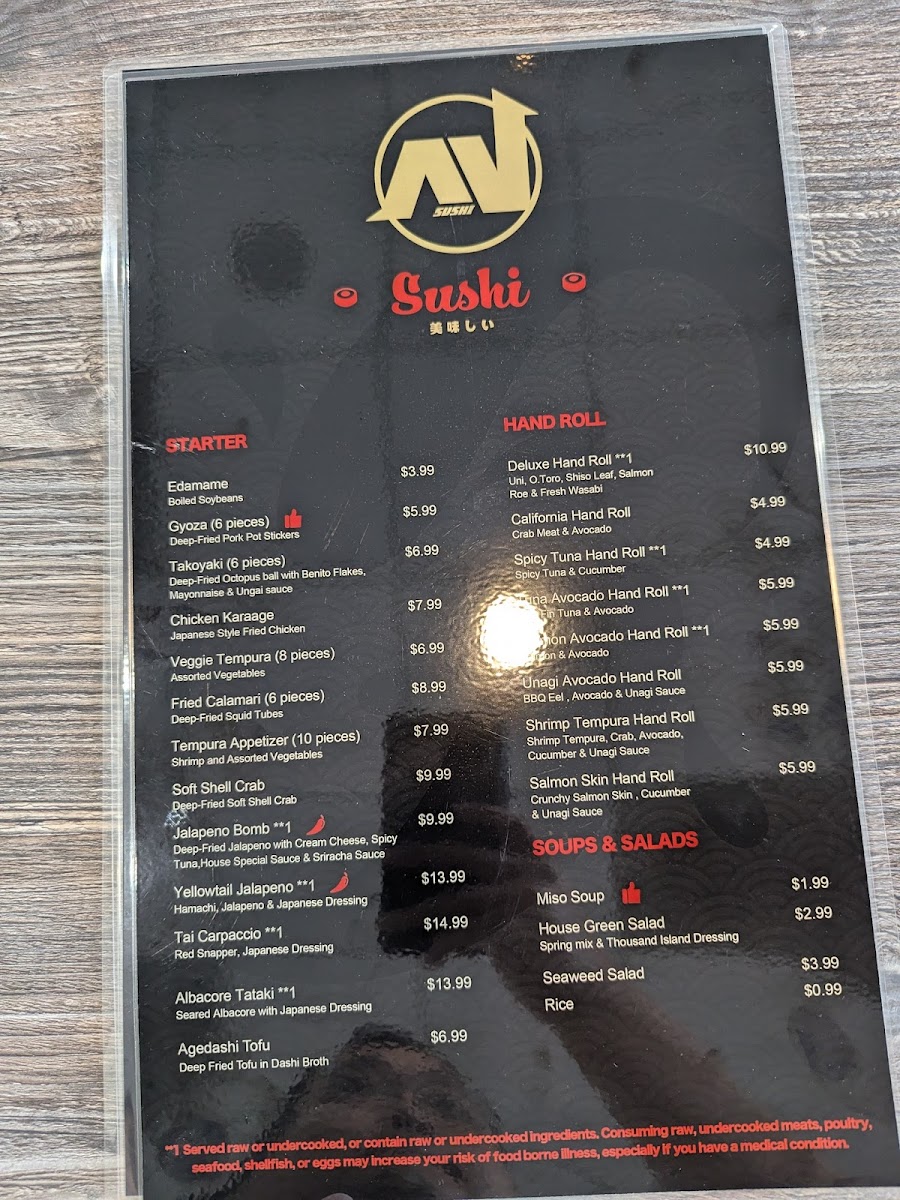 This menu is suitable for casual dining experiences and quick orders, accommodating both light meals with hand rolls and more complete lunches or dinners with entrees and classic rolls. It offers a range of options for guests looking for sushi as well as traditional Japanese main dishes.